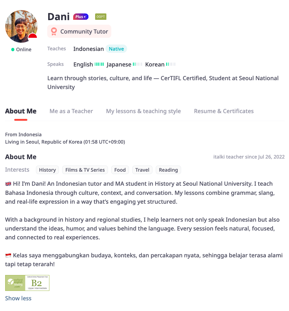 I teach Bahasa Indonesia and English to international students through online platforms such as iTalki, using conversation, storytelling, and real-life context as the core of my lessons.