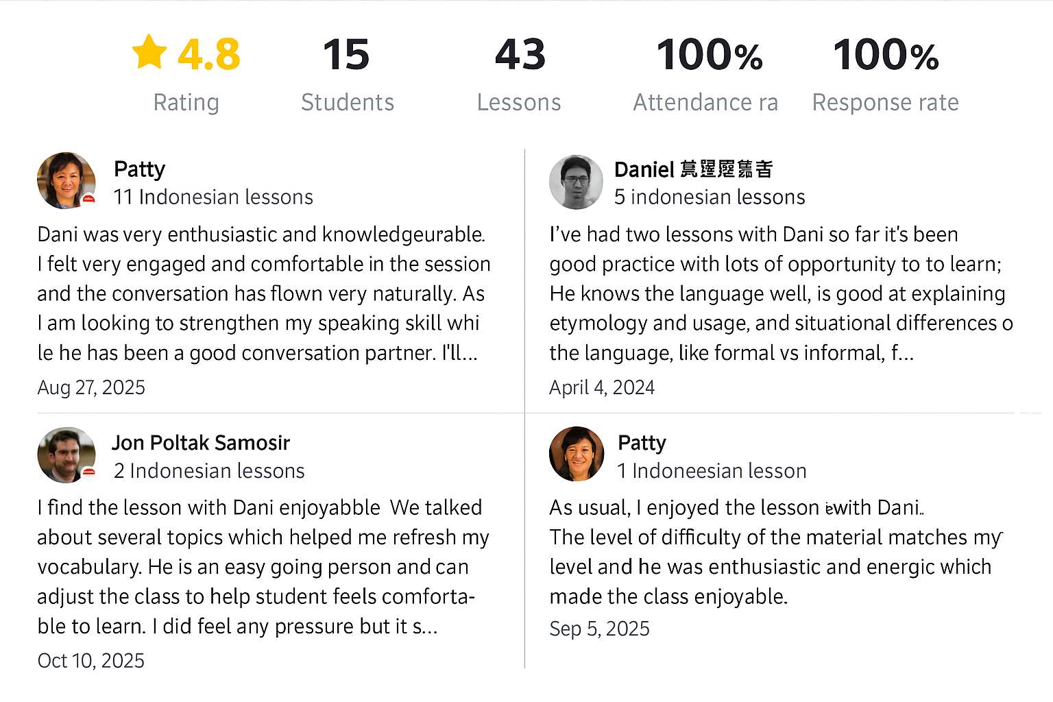 I teach Bahasa Indonesia and English to international students through online platforms such as iTalki, using conversation, storytelling, and real-life context as the core of my lessons.