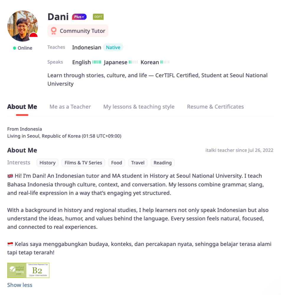 A complete profile and teaching journey as an Indonesian tutor on italki — focusing on natural conversation and everyday cultural learning.